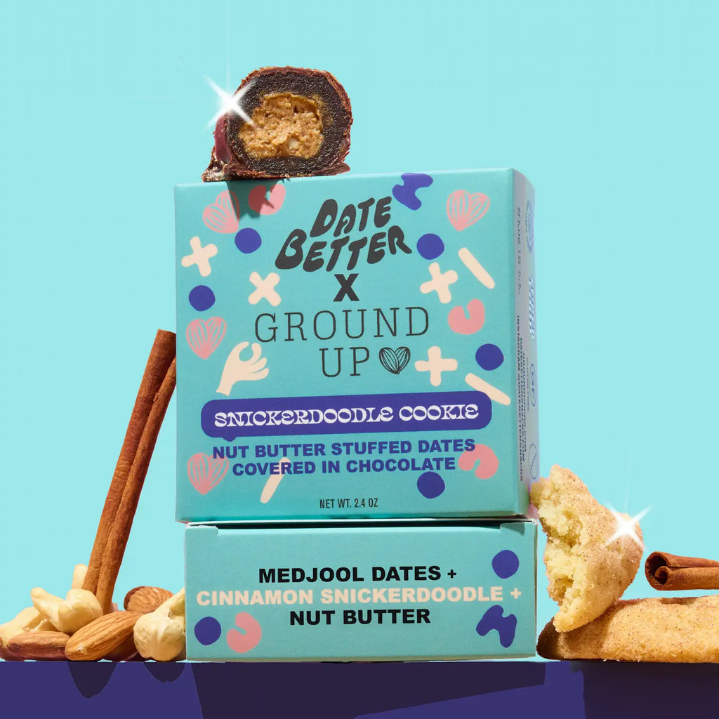 Snickerdoodle Cookie Crunch is cozy nostalgia wrapped in dark chocolate. Made in collaboration with our friends at Ground Up, this flavor features chewy Medjool dates stuffed with their iconic Cinnamon Snickerdoodle Nut Butter, dotted with cinnamon-dusted almond pieces. Each one is coated in 85% organic, fair trade dark chocolate—soy-free and free from emulsifiers. It’s a warm, cookie-inspired treat that brings that fresh-from-the-oven feeling into every bite.
